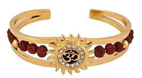 Details: This Men's Bracelet comes with Rudraksh American Diamond Gold Om Sun Cuff Kada ,Gold Colour plating which is of Premium Quality. high quality golden color alloy charm and golden beads.The bracelet is beaded by Rudraksha for perfect fit.